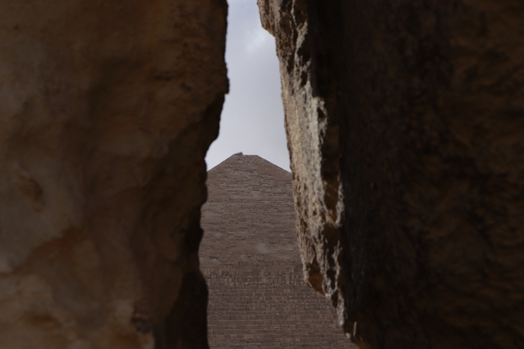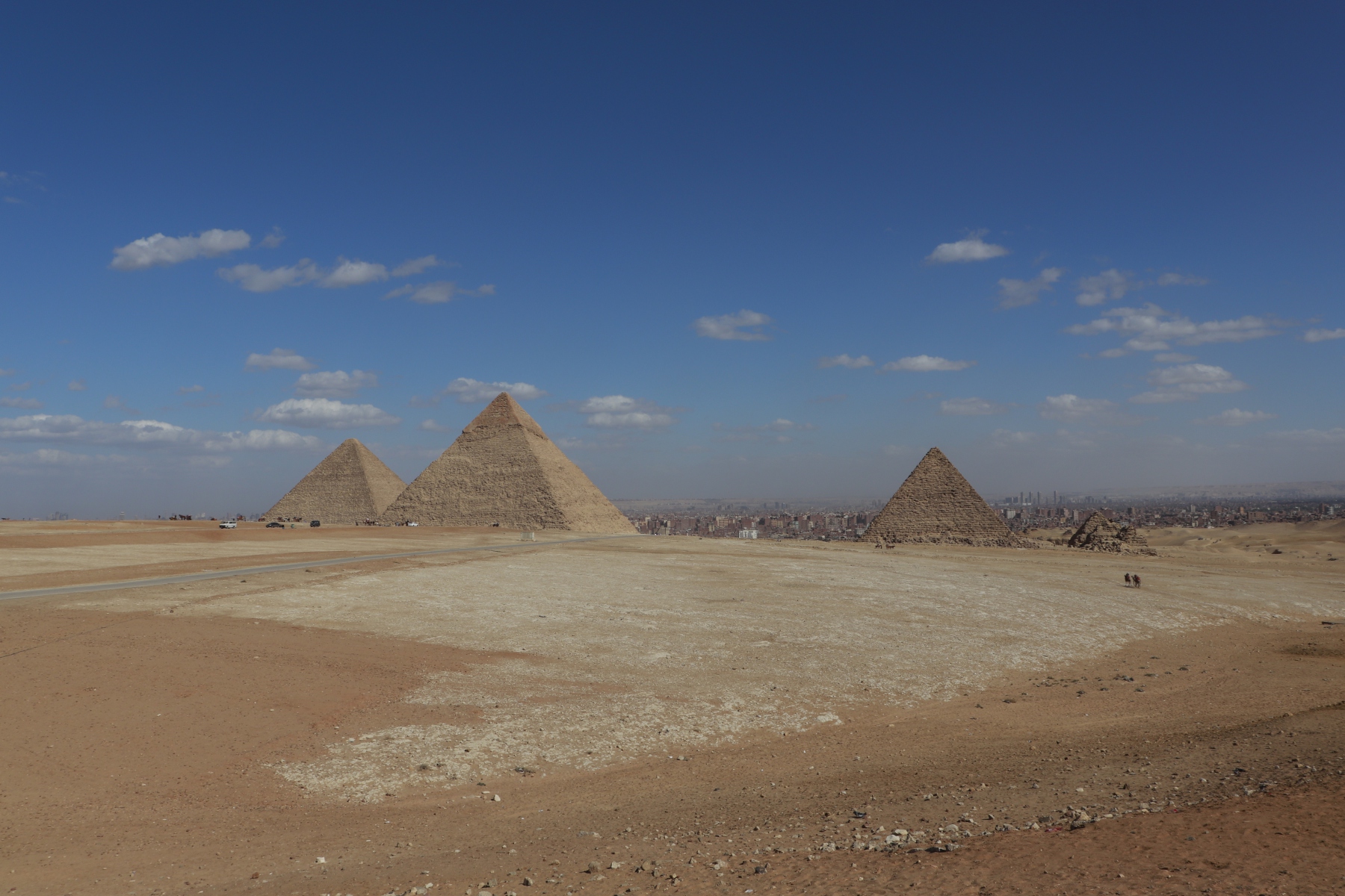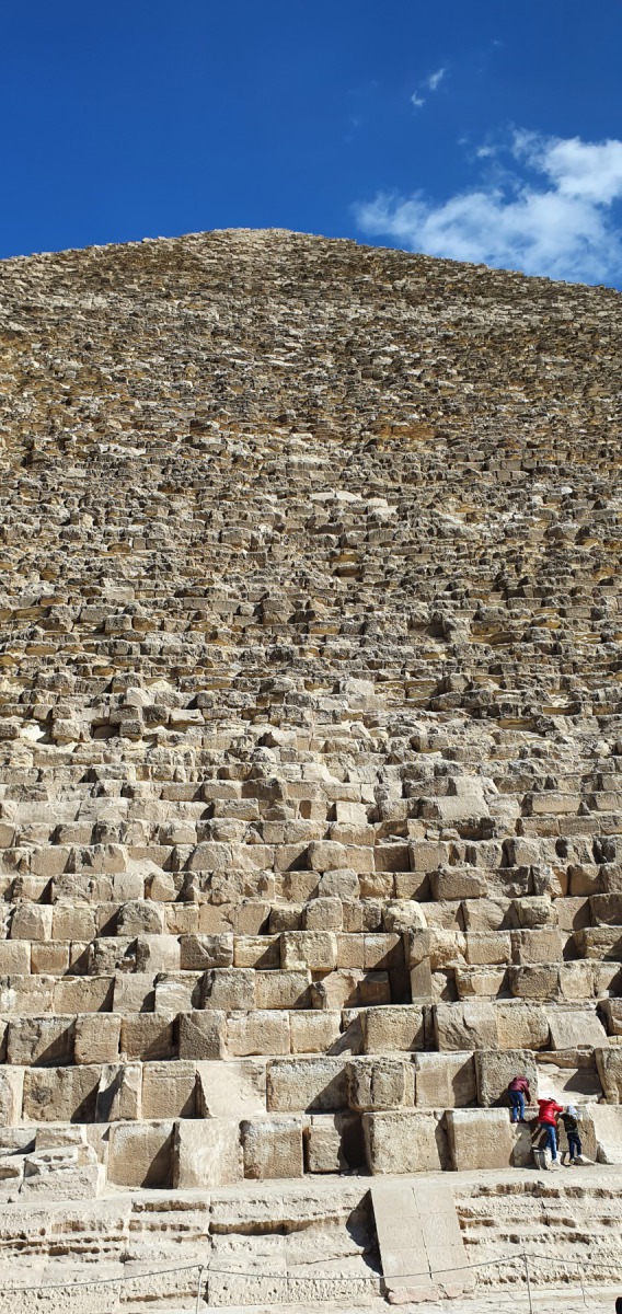 „Die Pyramieden“ ist etwas allgemein: Wir besuchten die Pyramiden von Gizeh, ca. 15 Kilometer entfernt vom Stadtzentrum Kairos. Es gibt natürlich noch viele weitere, einge sogar in Sichtweite am Horizont. Hier ging es zu den bekanntesten drei: Cheops-, Chefren und Mykerinos-Pyramide. Die größte dieser drei Bauwerke ist die Cheops-Pyramide. Heutzutage ist sie ca. 140 Meter hoch, früher war sie sogar noch ein paar Meter höher. Sie ist über viereinhalb Jahrtausende alt.