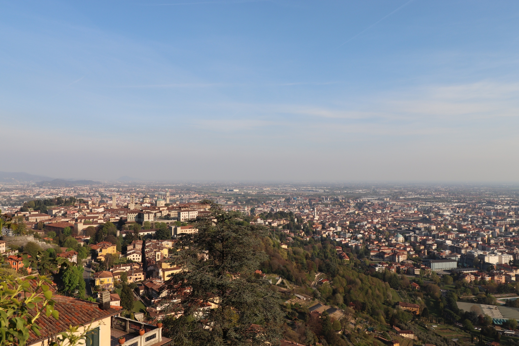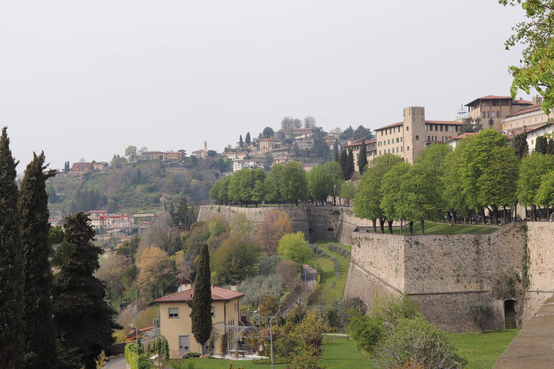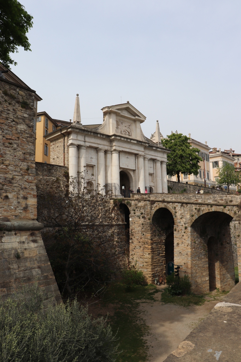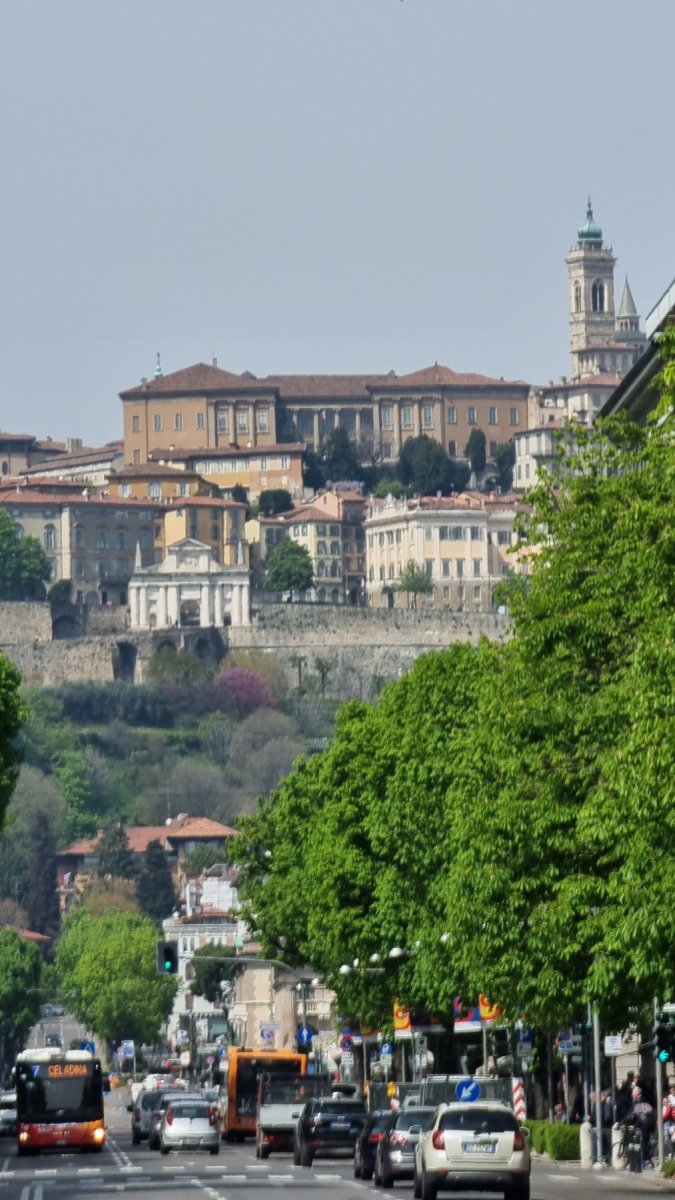 Nach dem Flug von Schönefeld nach Bergamo fand ich es sehr erfreulich, dass die Stadt fußläufig vom Flughafen zu erreichen ist. Ich schnallte mir meinen Rucksack auf den Rücken und wanderte gemütlich zum Hotel. Bei uns war es noch nass und kalt, hier im italienischen Alpenvorland war der Frühling schon mit Sonnenschein und Blütenpracht eingekehrt. Umso schöner war es dann, als die Stadt erst fern zwischen den Häusern aufragte und dann immer näherkam. Als die Altstadt in ihrer ganzen Pracht vor mir auf dem Berg erstrahlte, war ich auch schon am Hotel, dass direkt zu ihren Füßen lag. Nachdem ich mein Gepäck abgeworfen habe, ging es direkt hoch in die Oberstadt.