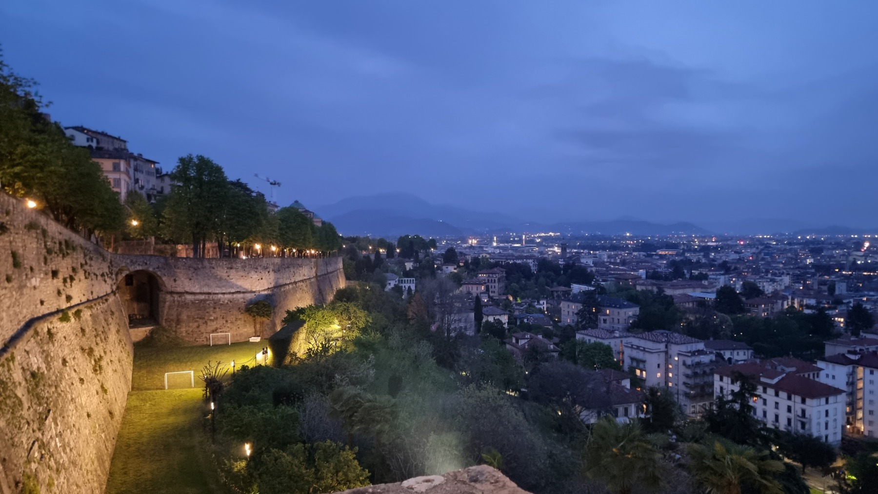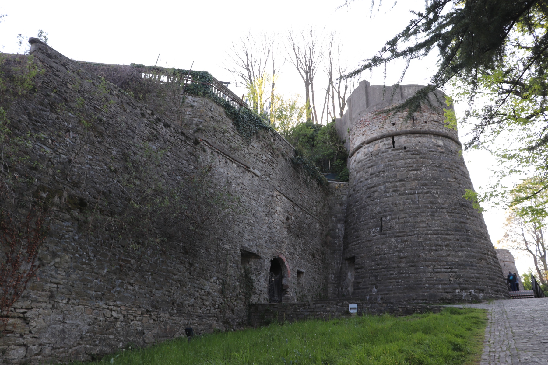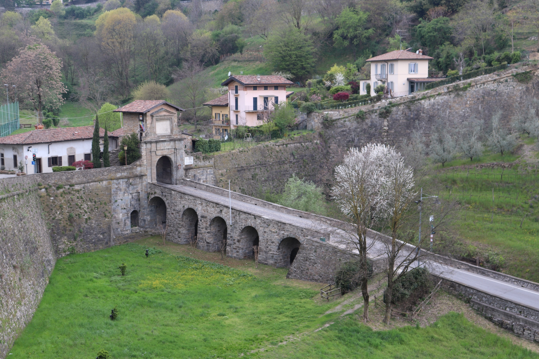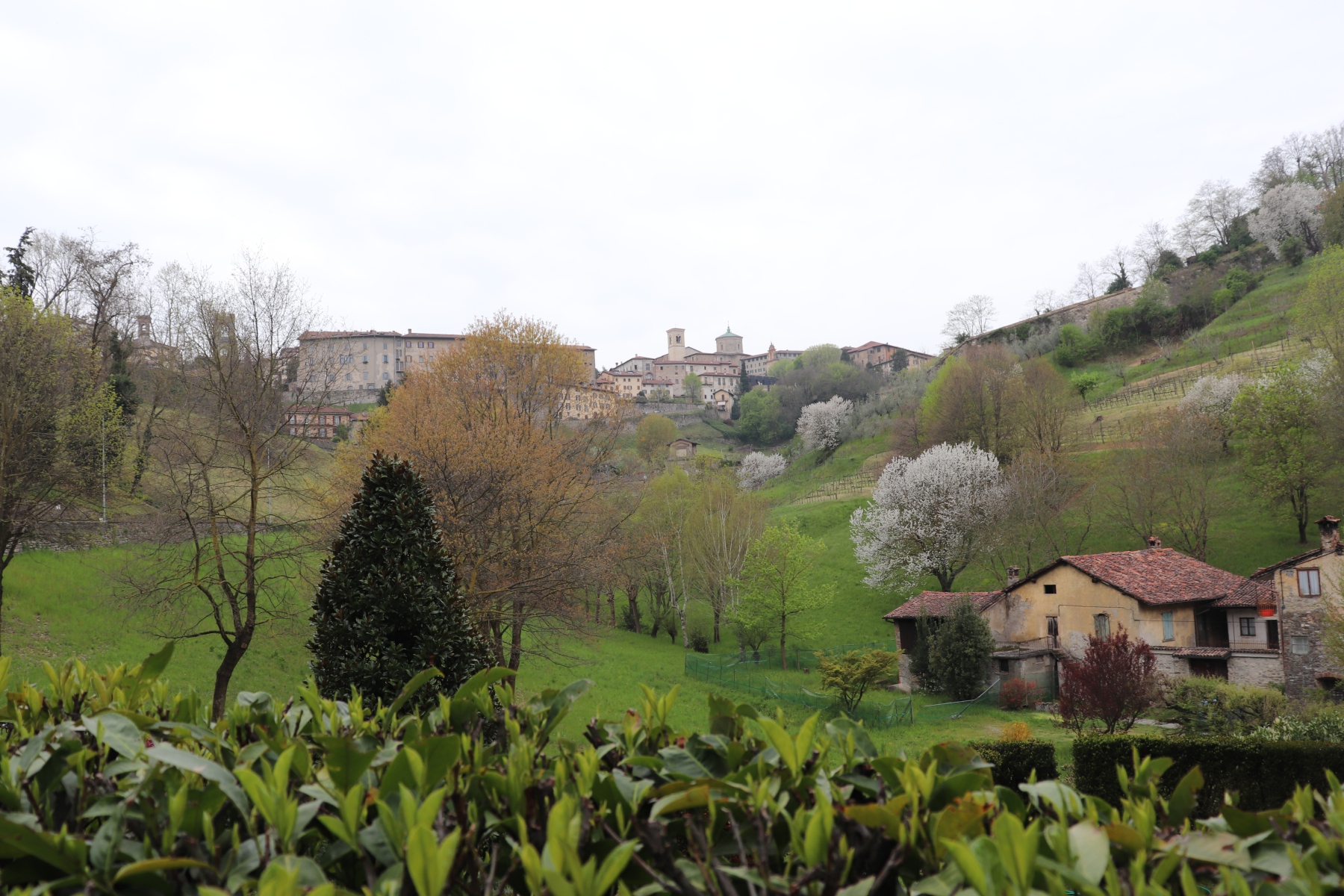 Nach dem Flug von Schönefeld nach Bergamo fand ich es sehr erfreulich, dass die Stadt fußläufig vom Flughafen zu erreichen ist. Ich schnallte mir meinen Rucksack auf den Rücken und wanderte gemütlich zum Hotel. Bei uns war es noch nass und kalt, hier im italienischen Alpenvorland war der Frühling schon mit Sonnenschein und Blütenpracht eingekehrt. Umso schöner war es dann, als die Stadt erst fern zwischen den Häusern aufragte und dann immer näherkam. Als die Altstadt in ihrer ganzen Pracht vor mir auf dem Berg erstrahlte, war ich auch schon am Hotel, dass direkt zu ihren Füßen lag. Nachdem ich mein Gepäck abgeworfen habe, ging es direkt hoch in die Oberstadt.