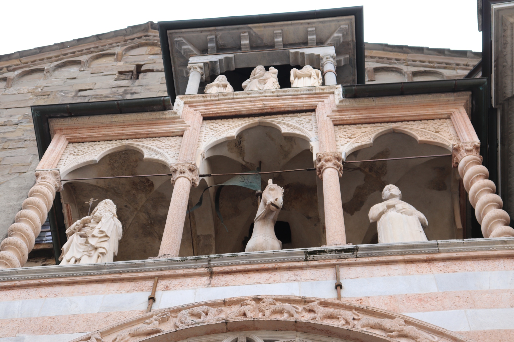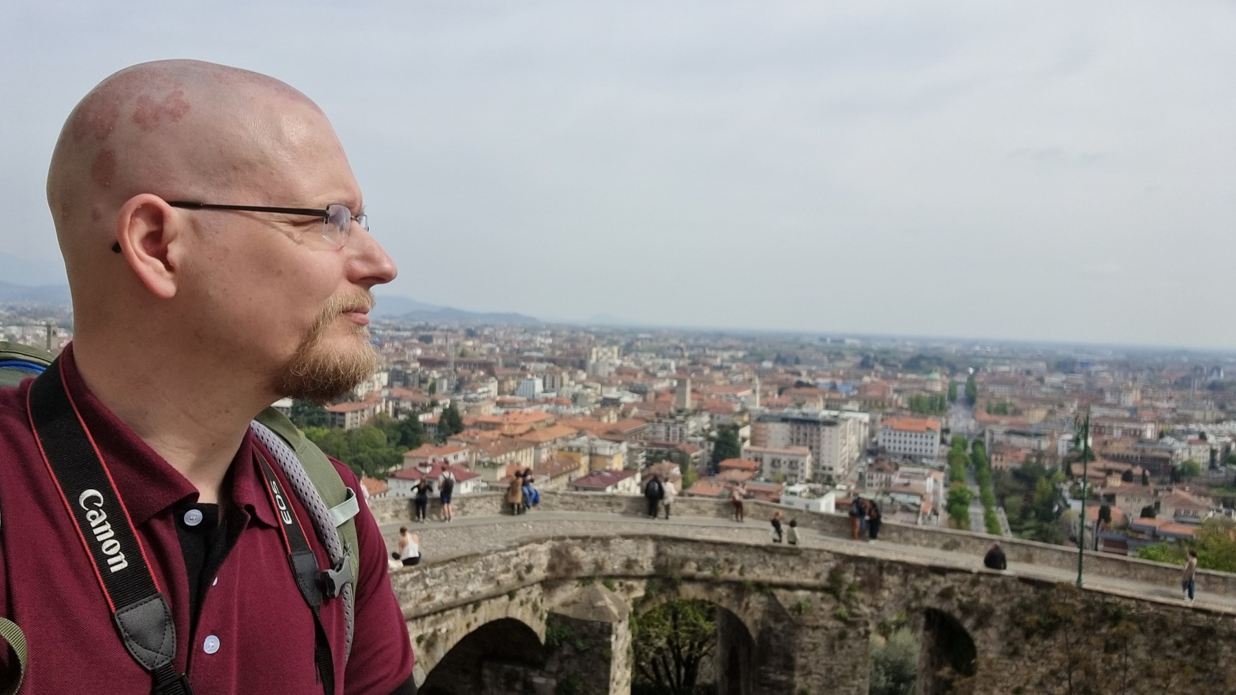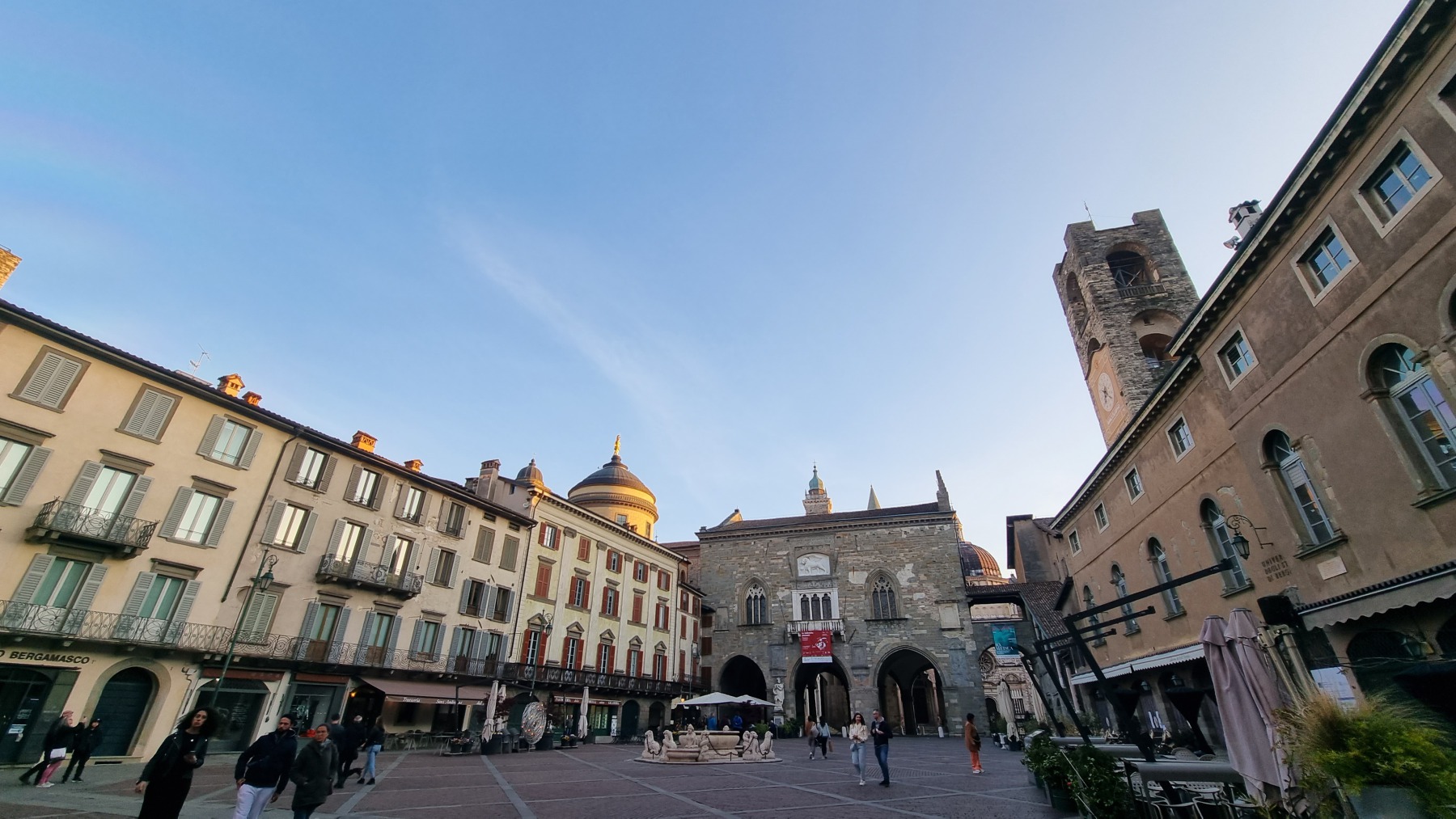 Nach dem Flug von Schönefeld nach Bergamo fand ich es sehr erfreulich, dass die Stadt fußläufig vom Flughafen zu erreichen ist. Ich schnallte mir meinen Rucksack auf den Rücken und wanderte gemütlich zum Hotel. Bei uns war es noch nass und kalt, hier im italienischen Alpenvorland war der Frühling schon mit Sonnenschein und Blütenpracht eingekehrt. Umso schöner war es dann, als die Stadt erst fern zwischen den Häusern aufragte und dann immer näherkam. Als die Altstadt in ihrer ganzen Pracht vor mir auf dem Berg erstrahlte, war ich auch schon am Hotel, dass direkt zu ihren Füßen lag. Nachdem ich mein Gepäck abgeworfen habe, ging es direkt hoch in die Oberstadt.