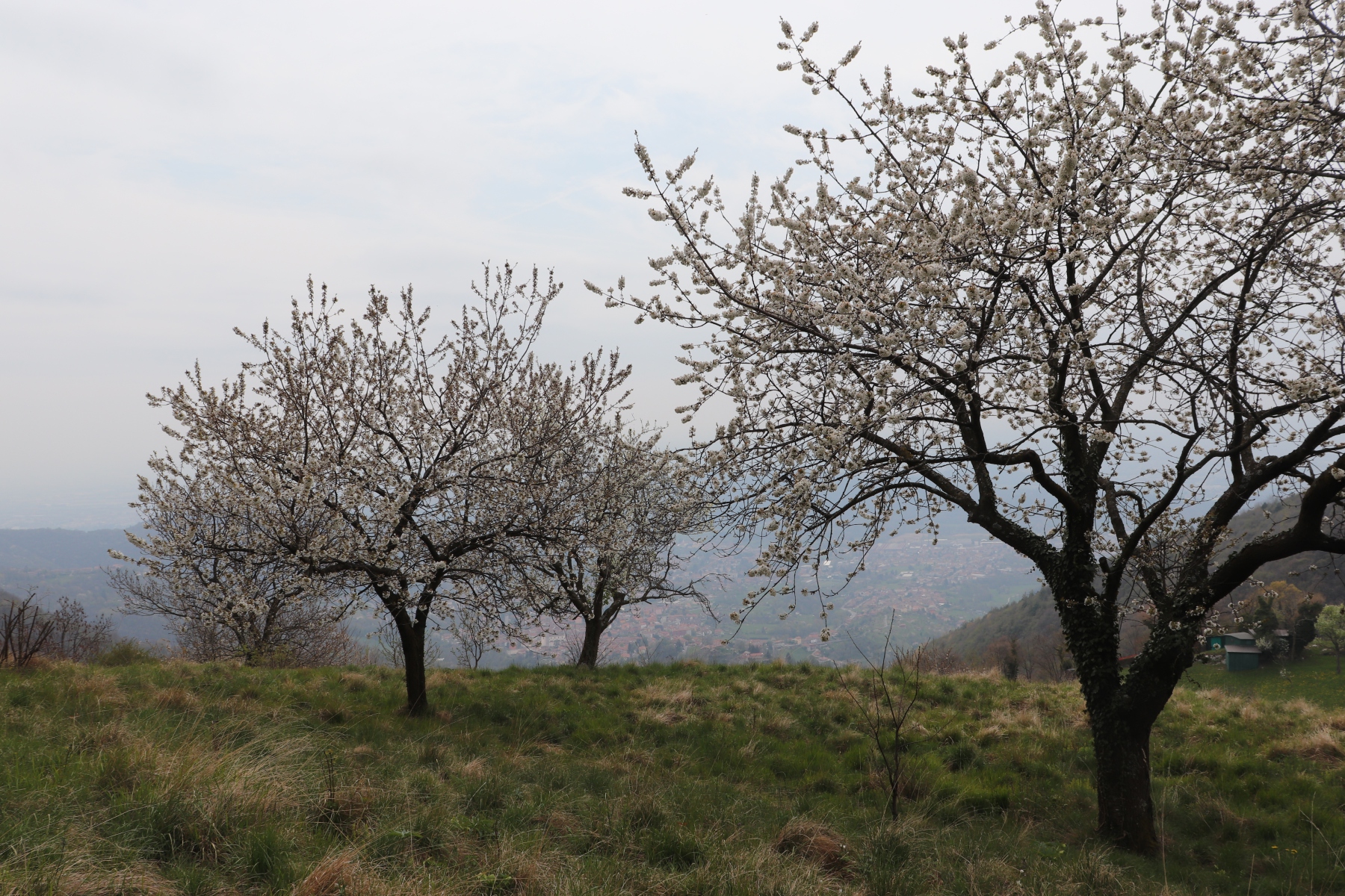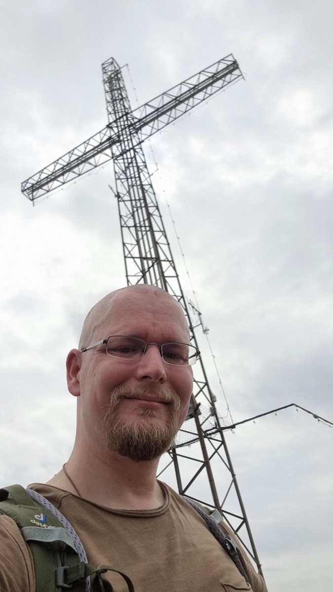 Oben angekommen kündigte sich von ferne ein Regenschauer an. Der Blick nach Norden auf die Alpen, als auch nach Süden Richtung Bergamo war leider etwas verhangen. Dennoch genoss ich die frische Luft am Gipfelkreuz.