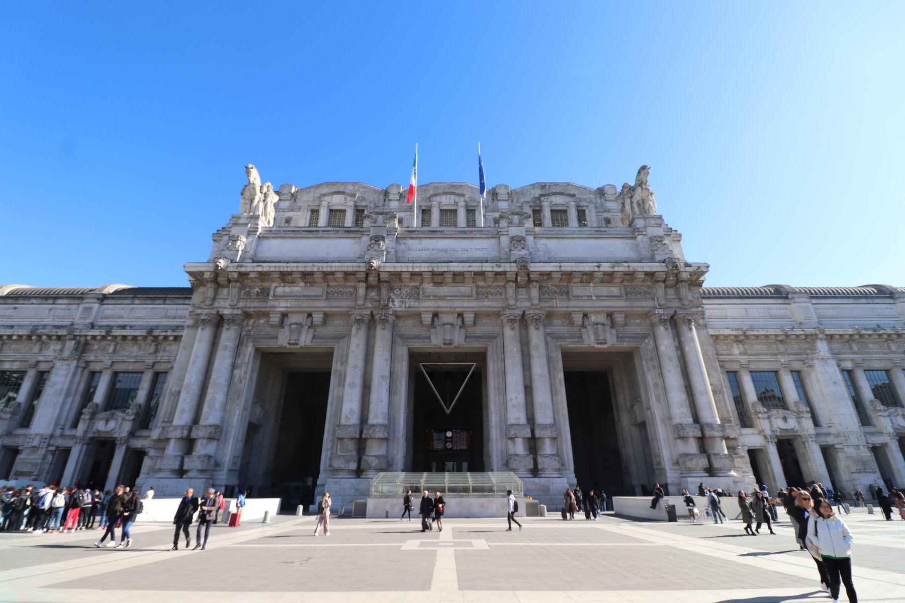 Der 14. April war der letzte Tag der kurzen Reise. In aller früh verließ ich mein Hotel und die Stadt Bergamo und brach nach Mailand (italienisch Milano, lombardisch Milan, lateinisch Mediolanum) auf. Schon am beeindruckenden Bahnhof erkennt man, dass Mailand zu den wohlhabenderen Städten gehört. Die (mit 1,4 Millionen Einwohnern) zweitgrößte Stadt Italiens ist Hauptstadt der Region Lombardei, sie ist eine führende Wirtschaftsmetropole Italiens und Universitätsstadt, u.a. befindet sich hier die größte katholische Universität der Welt.