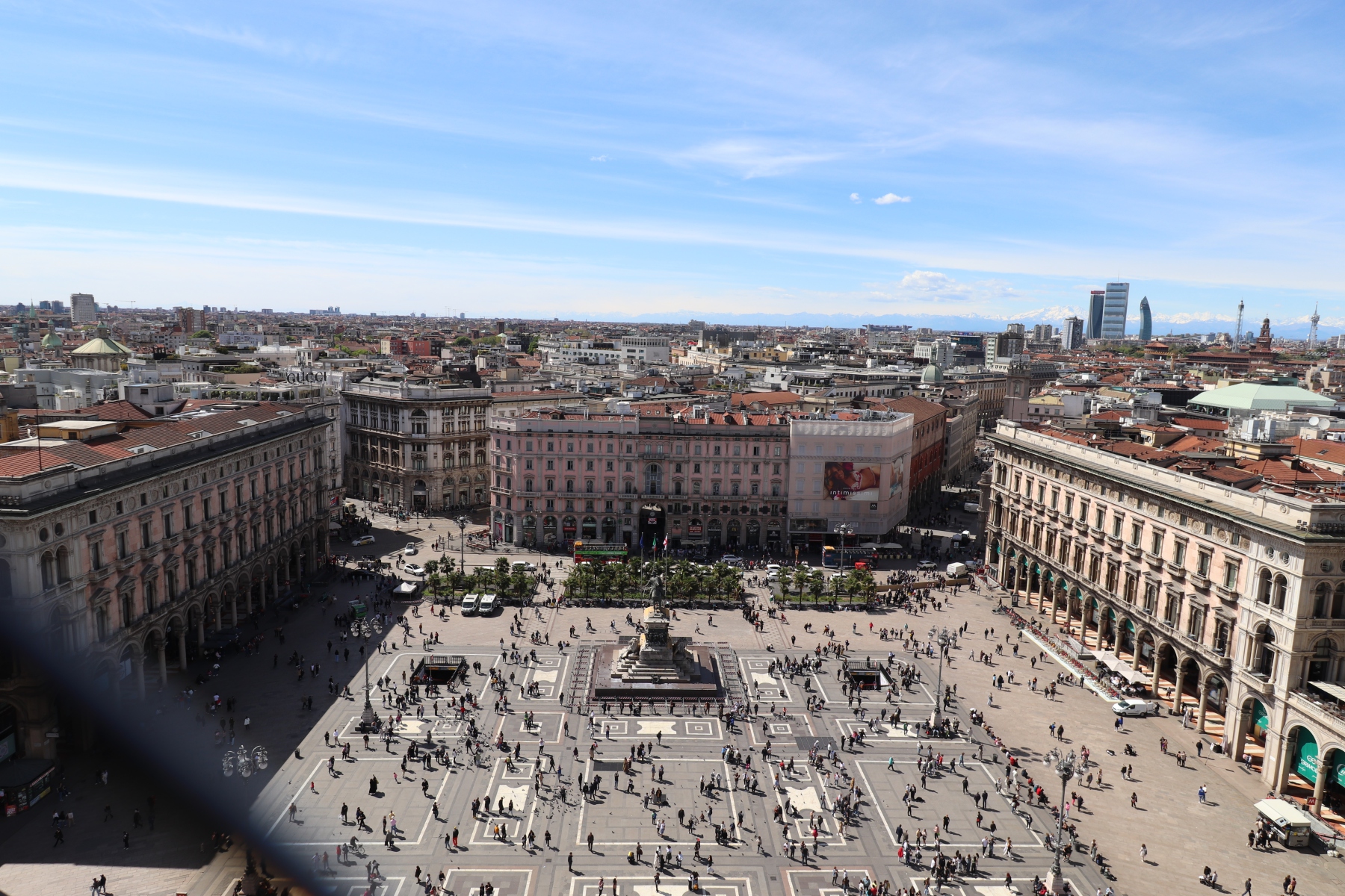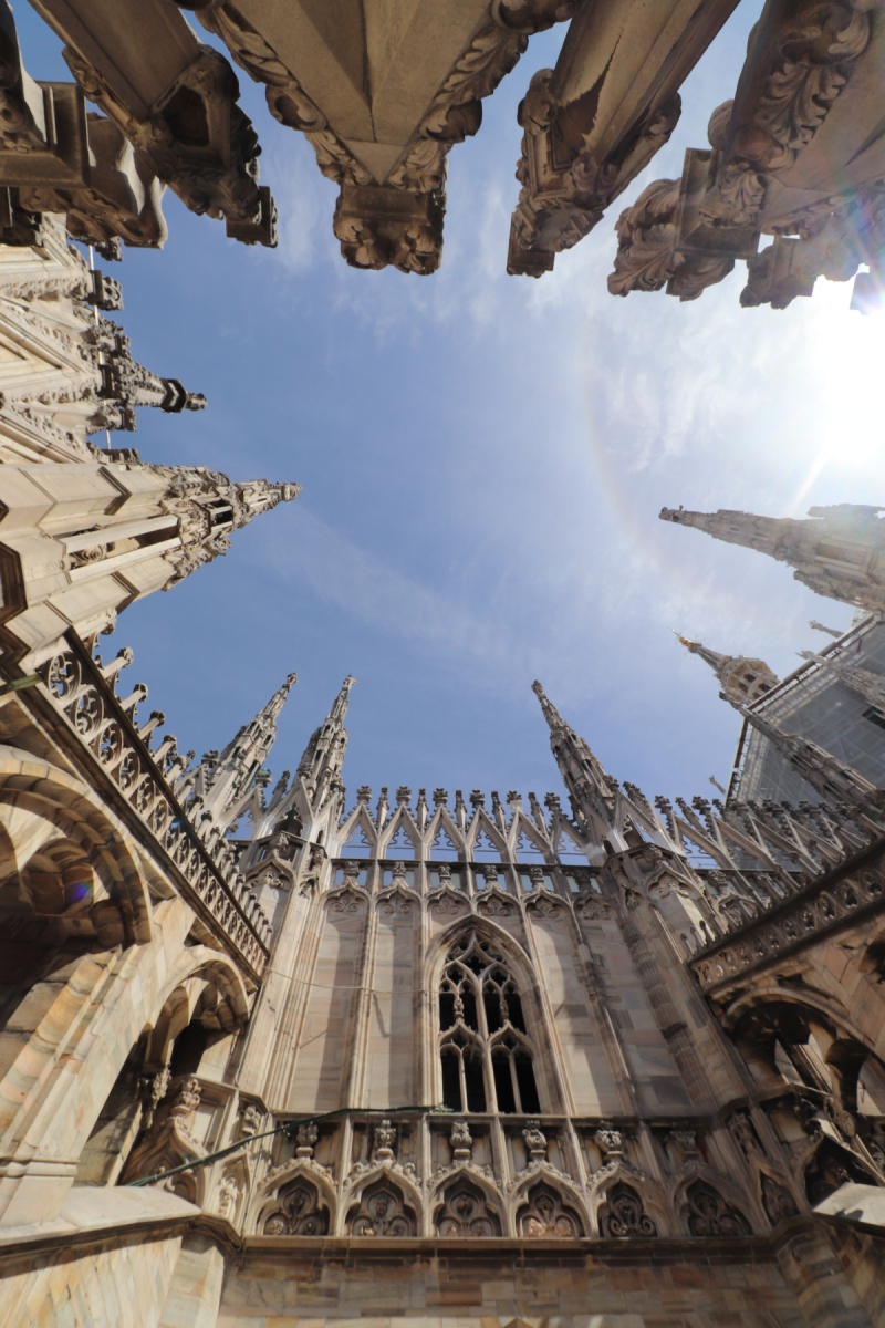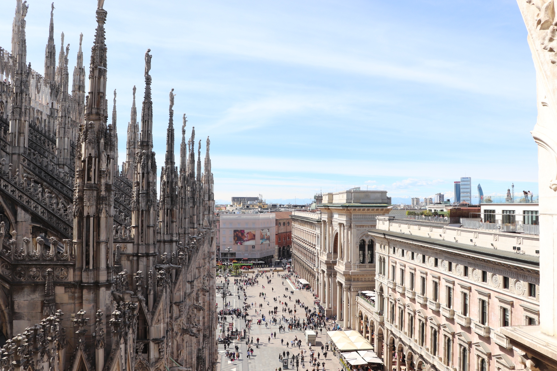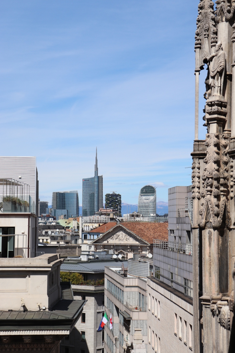 Den Domplatz sieht man am besten vom Dach des Domes. Hier startete auch meine Tour. Von oben sieht man auch die Schönheit der vielen Türme und Zierelemente von nahem. Darüber hinaus hat man einen guten Blick auf Mailand, sowohl die historische Innenstadt als auch auf die modernen Gebäude der italienischen Wirtschaftsmetropole des 21. Jahrhunderts.